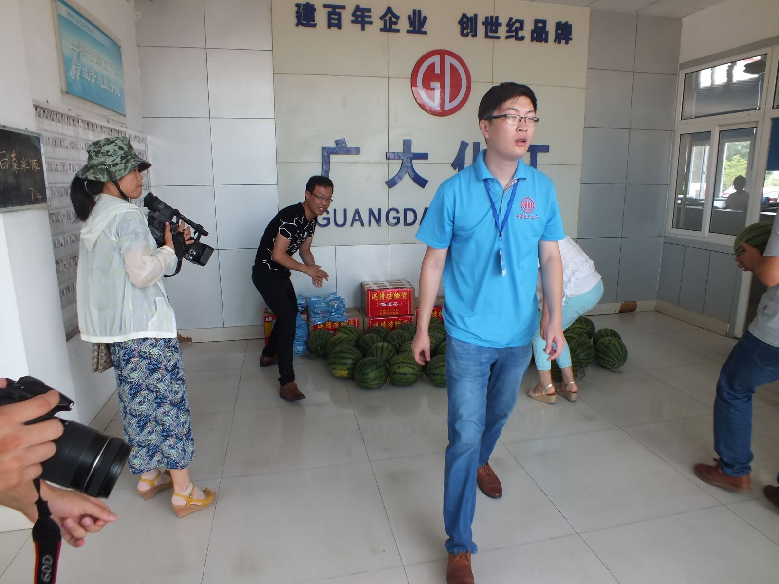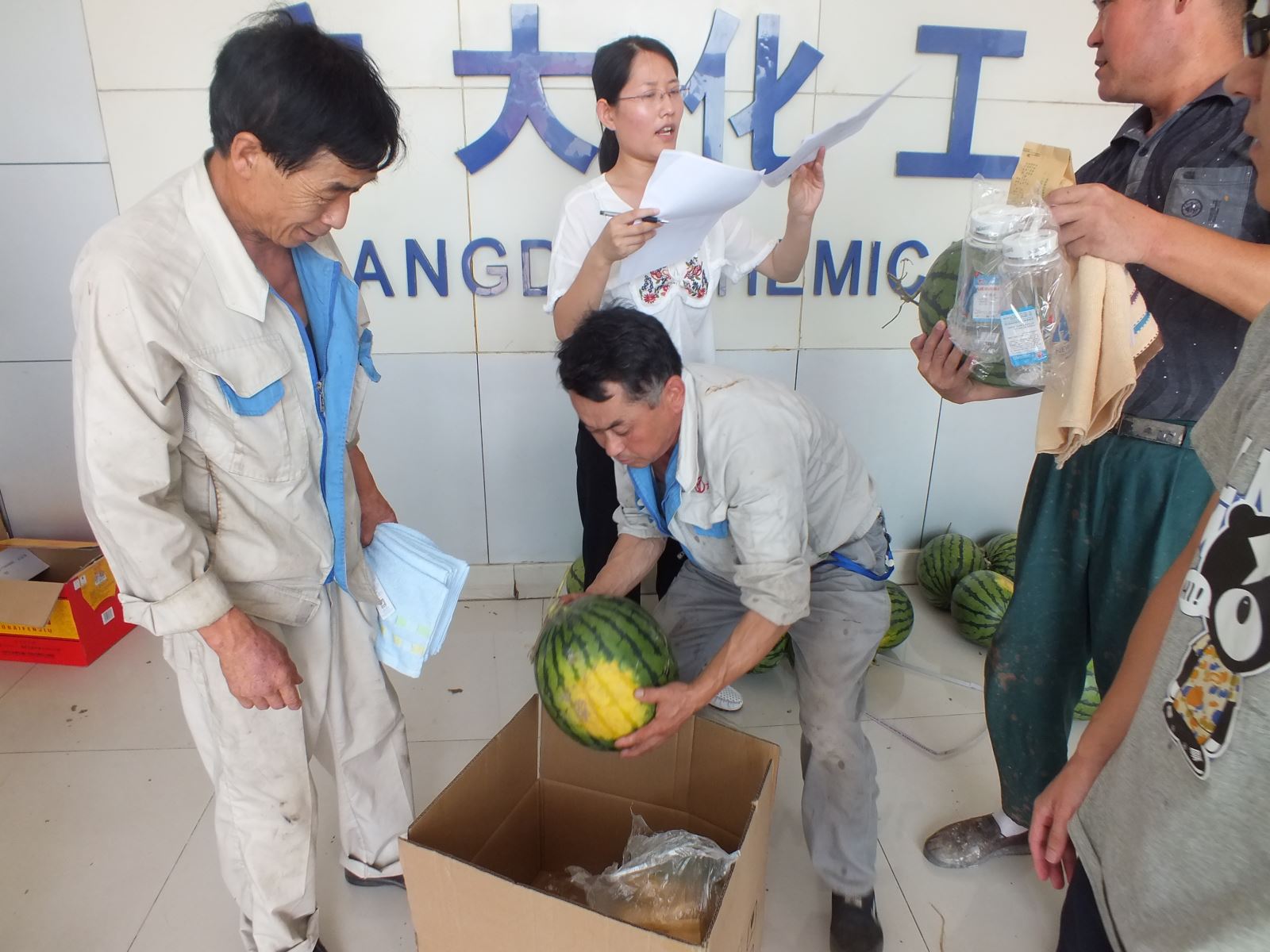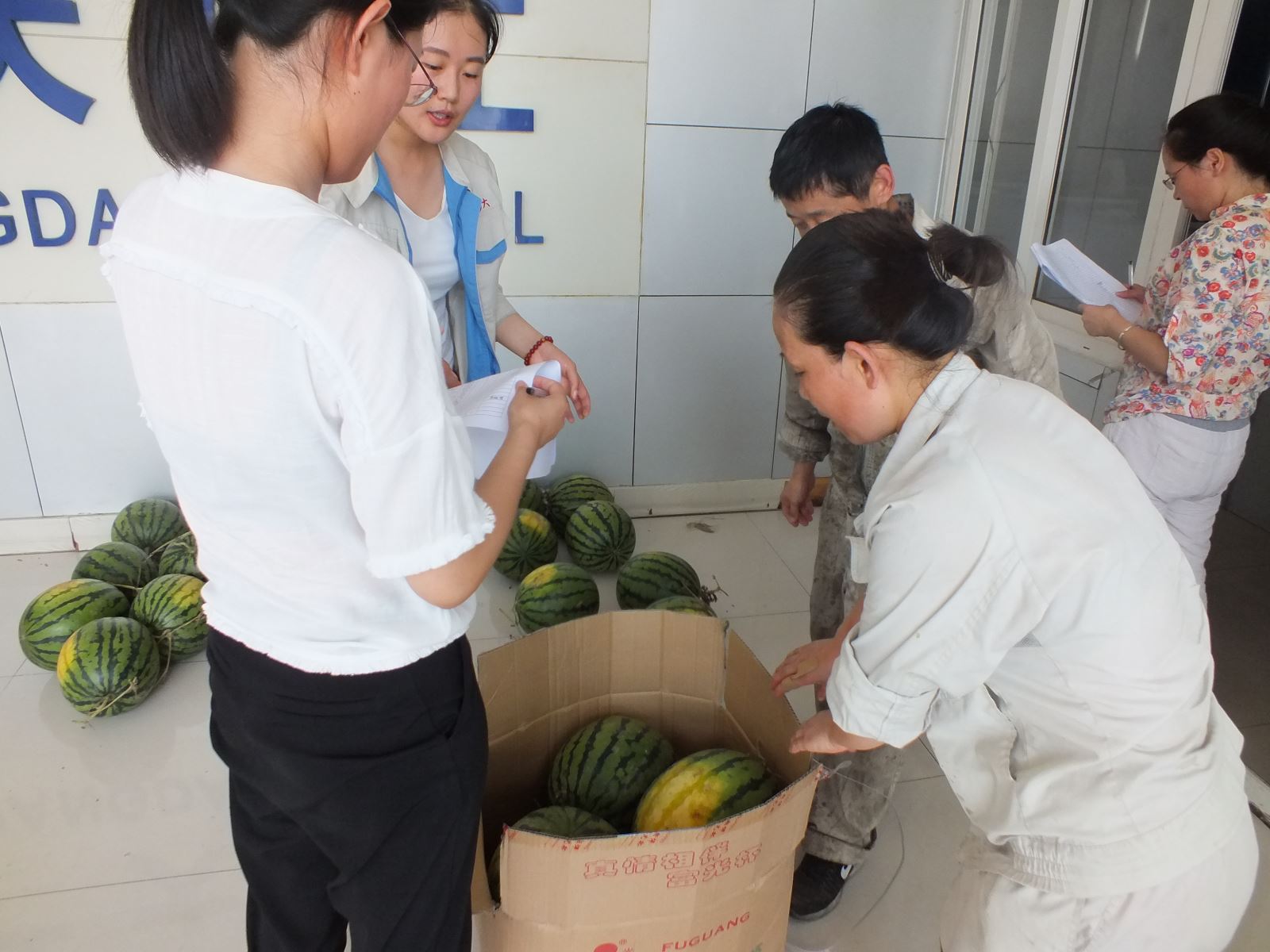 經(jīng)過一上午的準(zhǔn)備,所有的西瓜在整齊擺放,讓員工們第一時間吃上清涼可口的西瓜,緩解炎熱高溫帶來的疲憊。