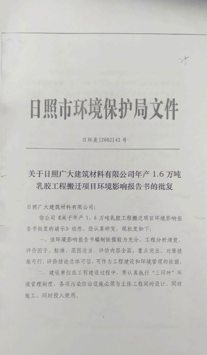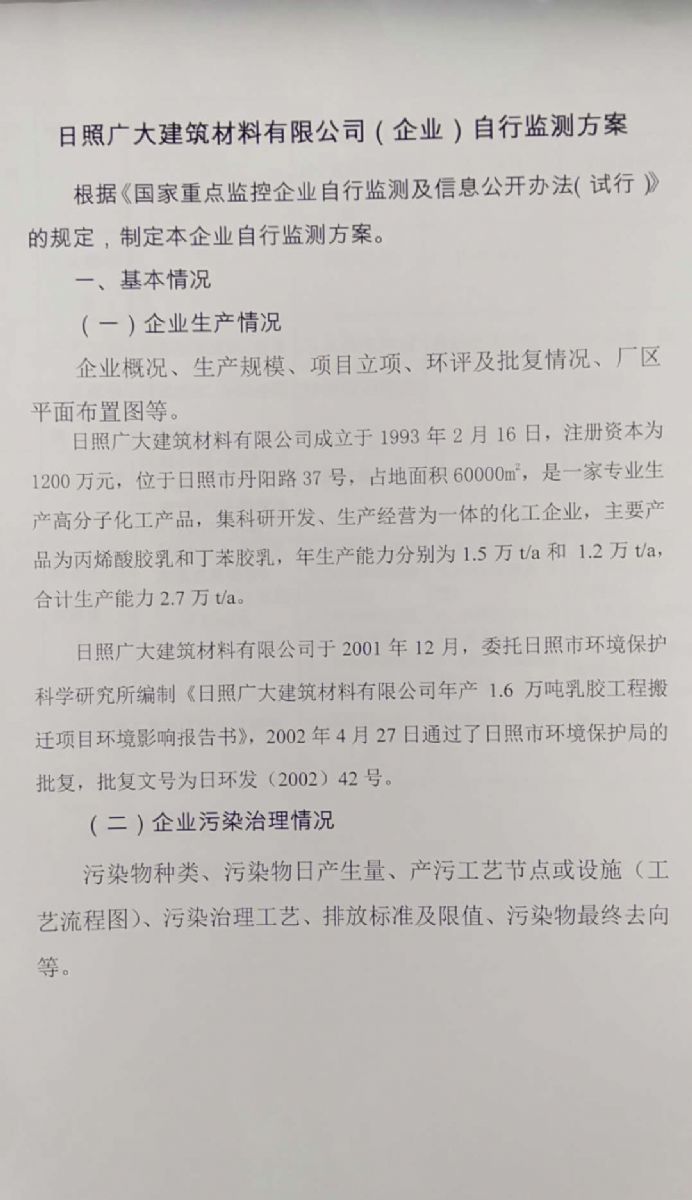日照廣大建筑材料有限公司,位于風景秀麗的海濱城市山東日照,成立于1988年,是專業(yè)生產(chǎn)高分子化工產(chǎn)品,集科研開發(fā)、生產(chǎn)經(jīng)營為一體的化工企業(yè),主要產(chǎn)品為丙烯酸脂類乳液和丁苯膠乳。是國內目前江北同行業(yè)產(chǎn)銷量最大企業(yè)之一。