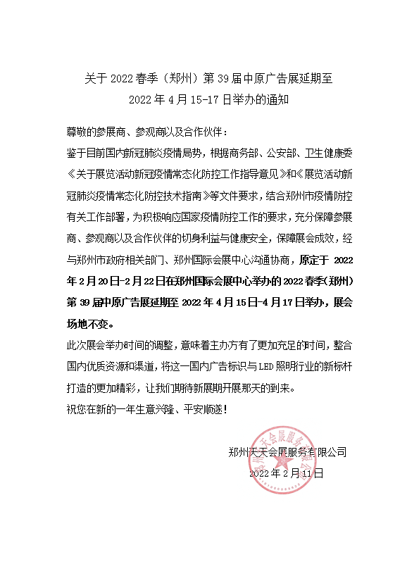 根據(jù)近期國內(nèi)新冠肺炎疫情形勢,為積極響應(yīng)國家疫情防控工作的要求,充分保障參展商、參觀商以及合作伙伴的切身利益與健康安全,鄭州天天會(huì)展服務(wù)有限公司將原定于今年2月20-22日舉辦的2022春季(鄭州)第39屆中原廣告展延期至4月15 -17日進(jìn)行,展會(huì)原定場地不變。